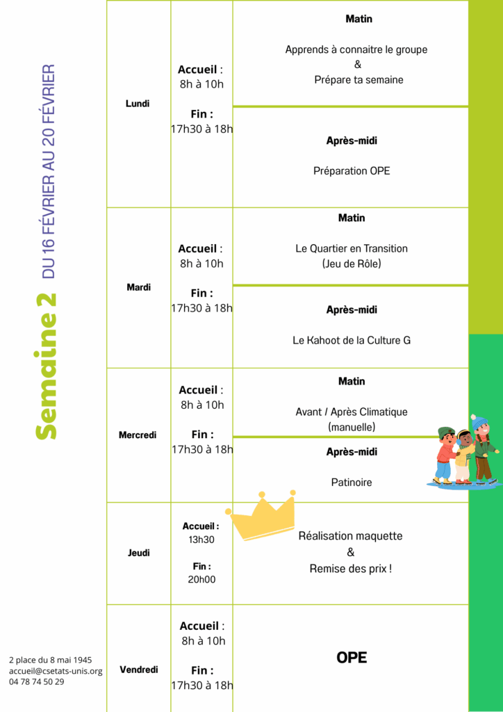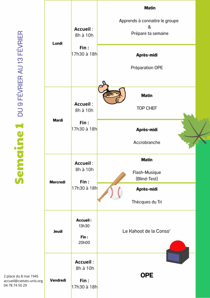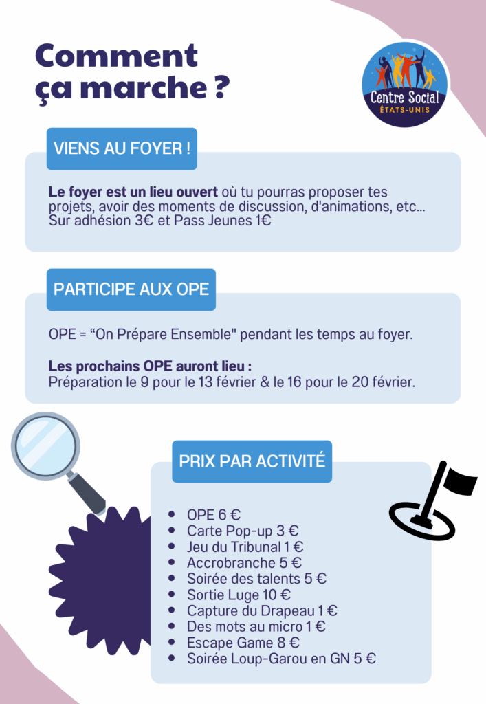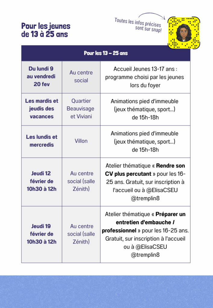Pour les jeunes… un programme sur mesure ! Les activités sont imaginées collectivement au début de la semaine lors des temps de discussion appelés « OPE » (on prépare ensemble). Rejoignez le groupe snap pour discuter avec la référente jeunesse : @Jeunes8eme
